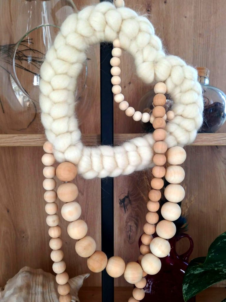 Olann c'est la laine qui enveloppe, le bois équilibre, et ensemble ils murmurent l'amour d’un foyer qui rassure, où chaque geste, chaque regard se pose, et où la chaleur devient présence, le calme d'un refuge, avec au centre ce cœur en laine qui bat doucement, fragile et vivant, rappelant que chaque création porte une part d’émotion et un souffle de tendresse suspendu dans la maison.